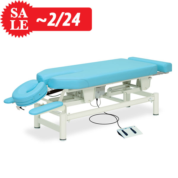 ■うつ伏せでの施術に最適な専用手置き台付き電動旋回昇降施術台。